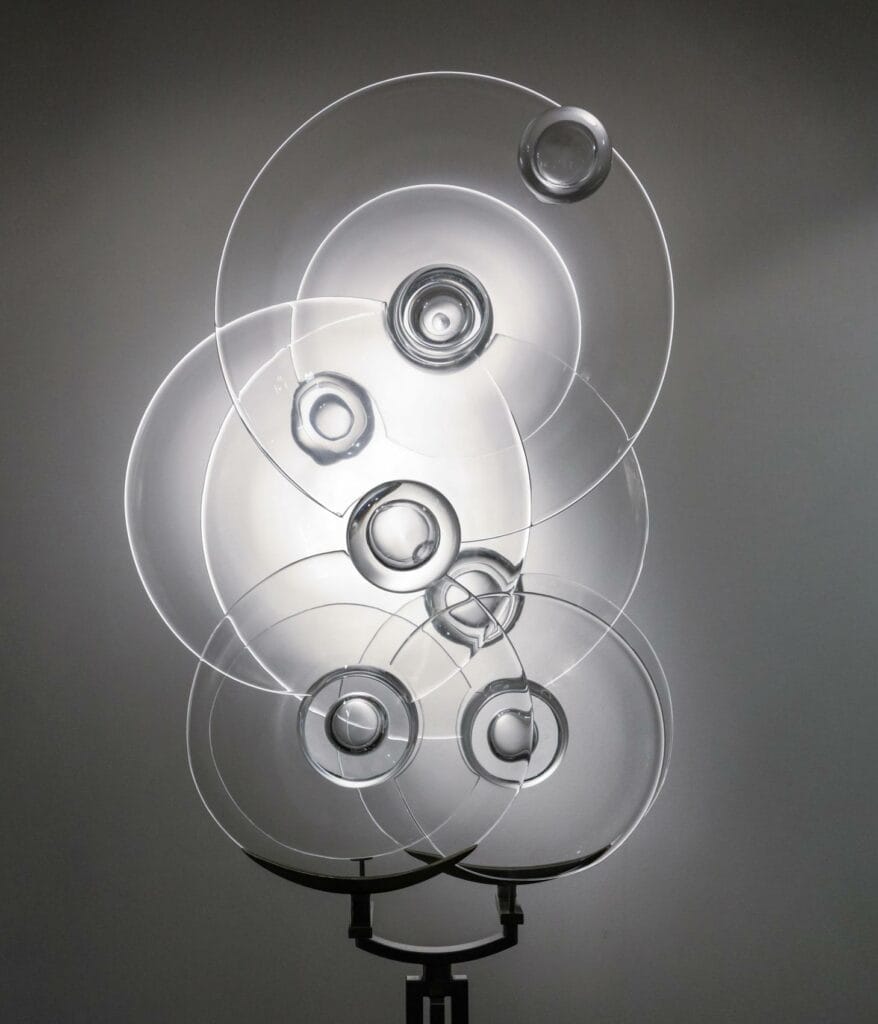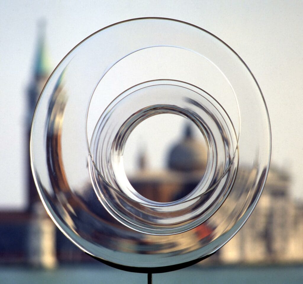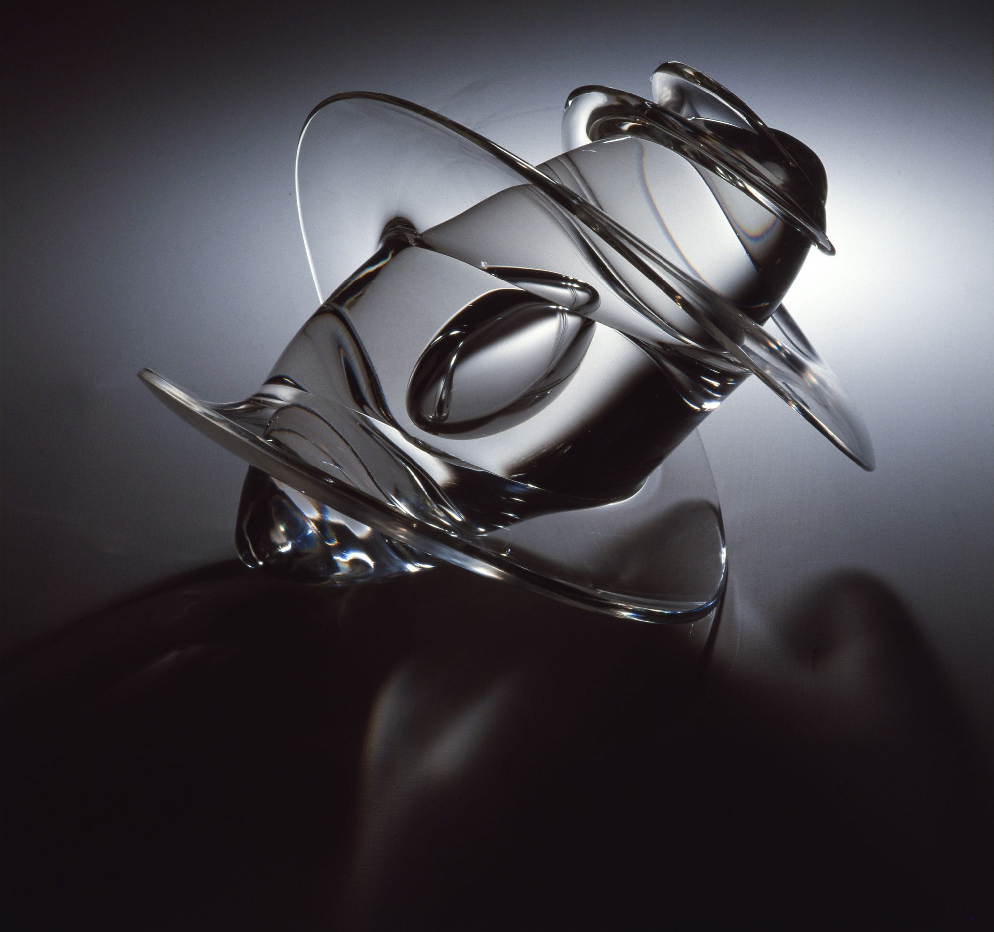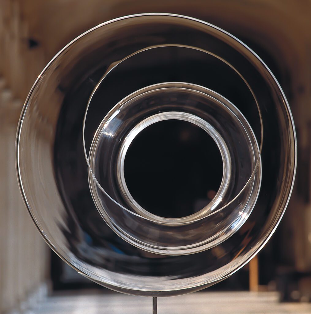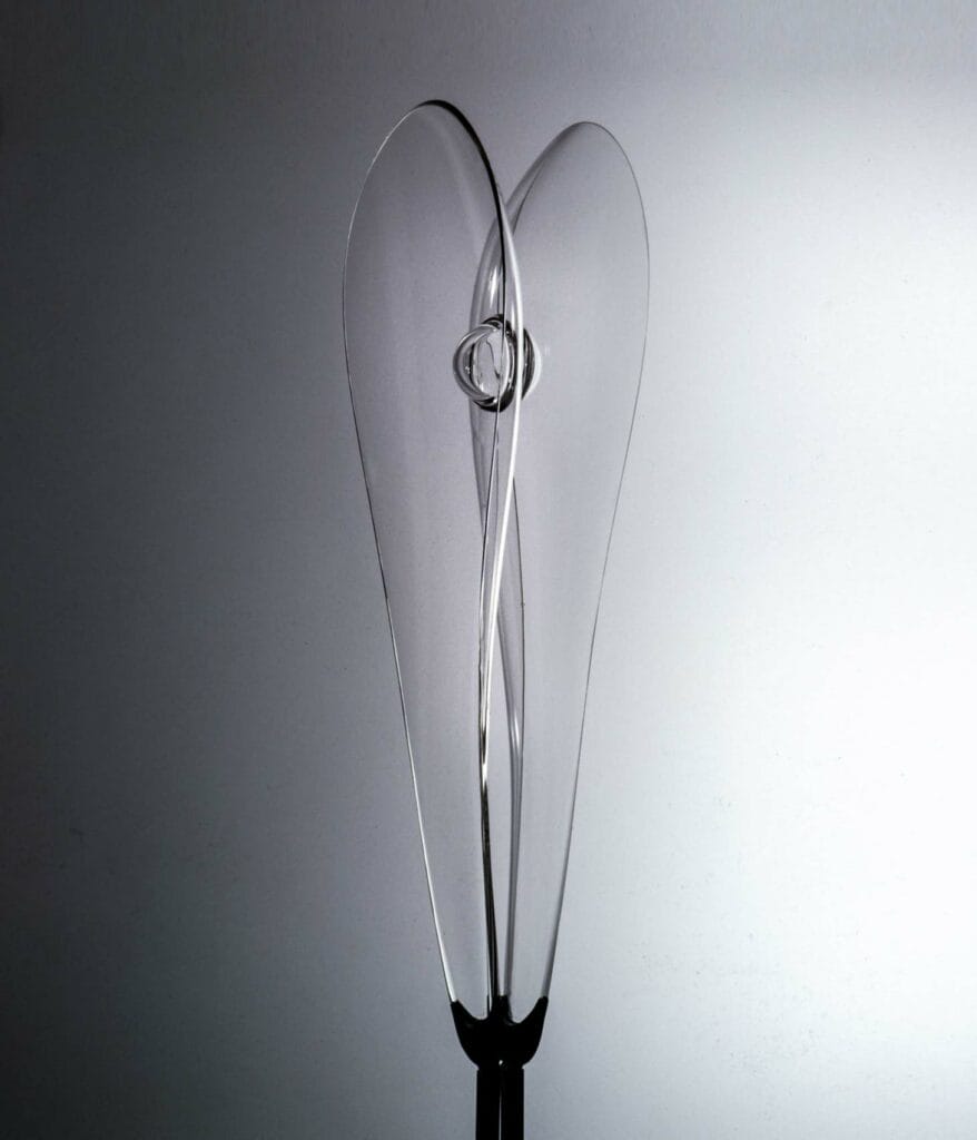 During this period, Seguso resumed experimenting with forms of different glass volumes engaging in new creations. Meanwhile, the chromatic temptations disappeared definitively from his creative universe to give voice to an event that does not set boundaries for his sculptural investigation. In this case, the artist reaches the apex with the work Vortice, a challenge towards the impossible for the lightness and laboriousness of the interlocking of the forms. Still, his imagination stimulates him to search for new horizons.