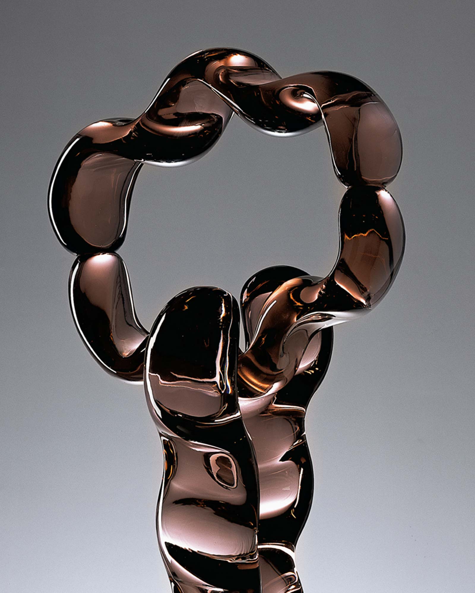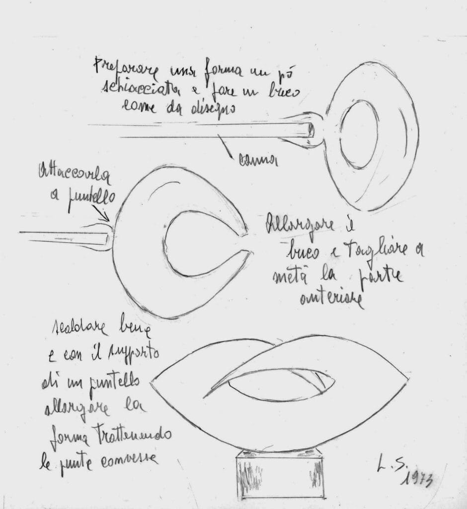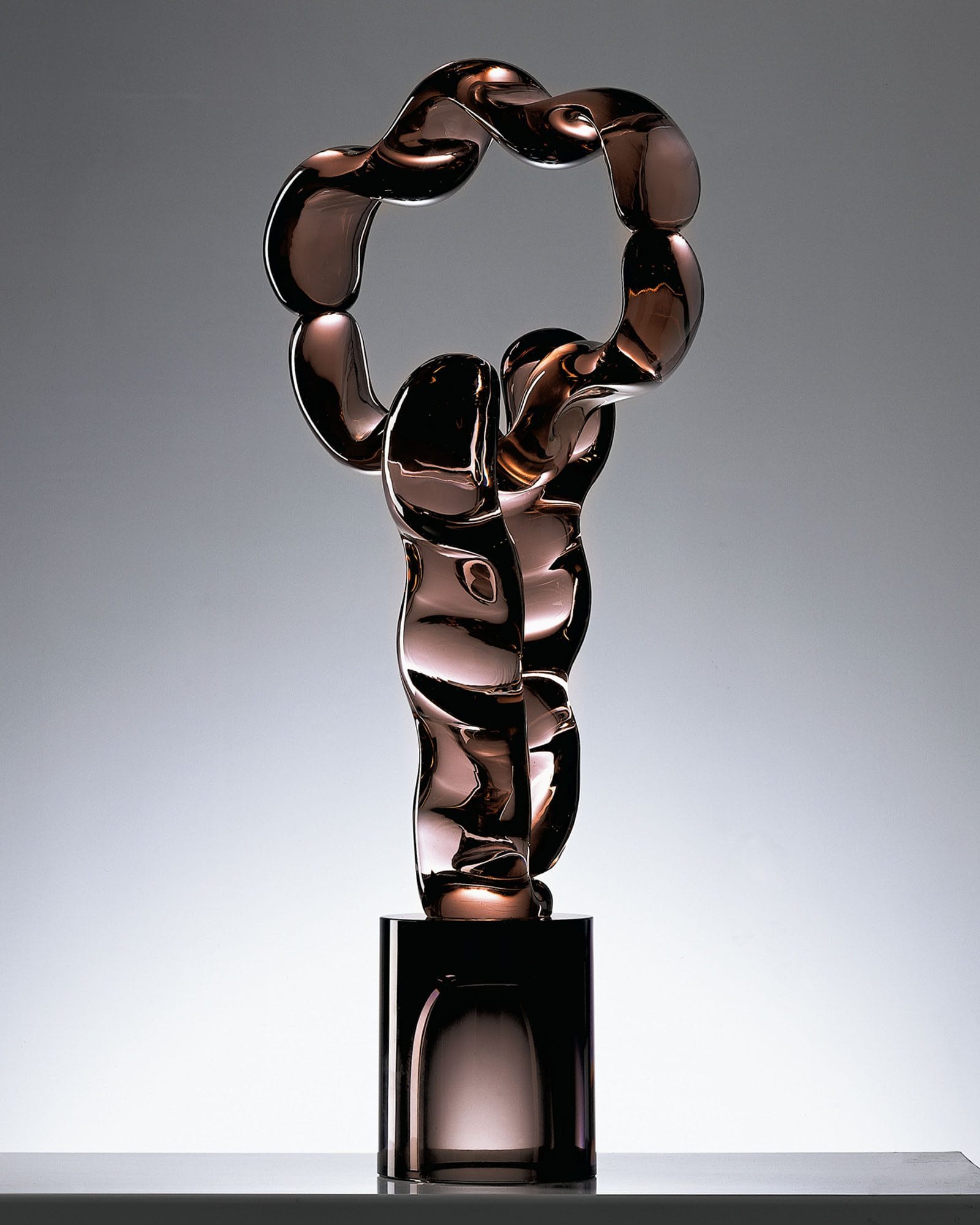 …Livio Seguso’s glasses do not indulge in technical effects. They are made of hot glass, generated from a nucleus intertwined into the dialectic of light, whose illuminated and illuminating form is an ambiguous reflected image. […]In the emblematic symbolic form, the annulment of sculpture as analysis occurs through the concession that sculpture must be poetry. The tight linearity of curves and counter-curves, the simultaneity of imperceptible movements, and the bringing back of the plane of convex and concave profiles capable of isolating fragments of unmistakable sensuality translate this rapacious ecstasy with restlessness and passionate melancholy.